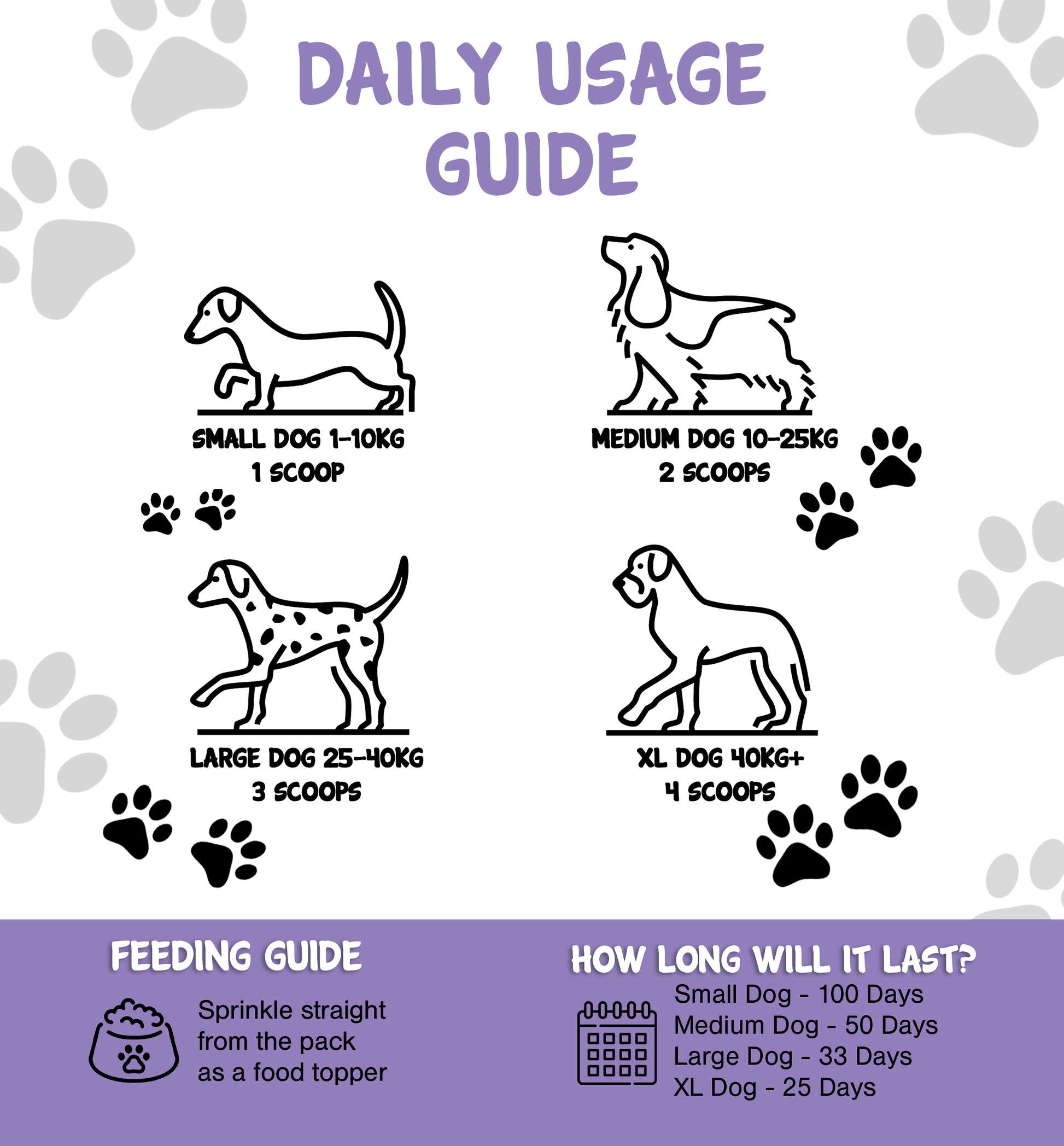 | Dog Size | Scoops | Days Supply |