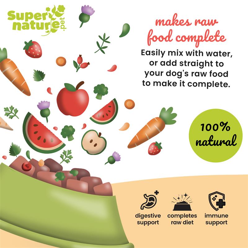 Complete your dog's raw diet with a nourishing blend of 12 fruits and vegetables, 15 botanical herbs & spices, and 20 essential vitamins & minerals, plus pre & postbiotics. This blend is the perfect complement to balance a raw meat diet, helping to support immunity, digestion, and overall wellbeing.