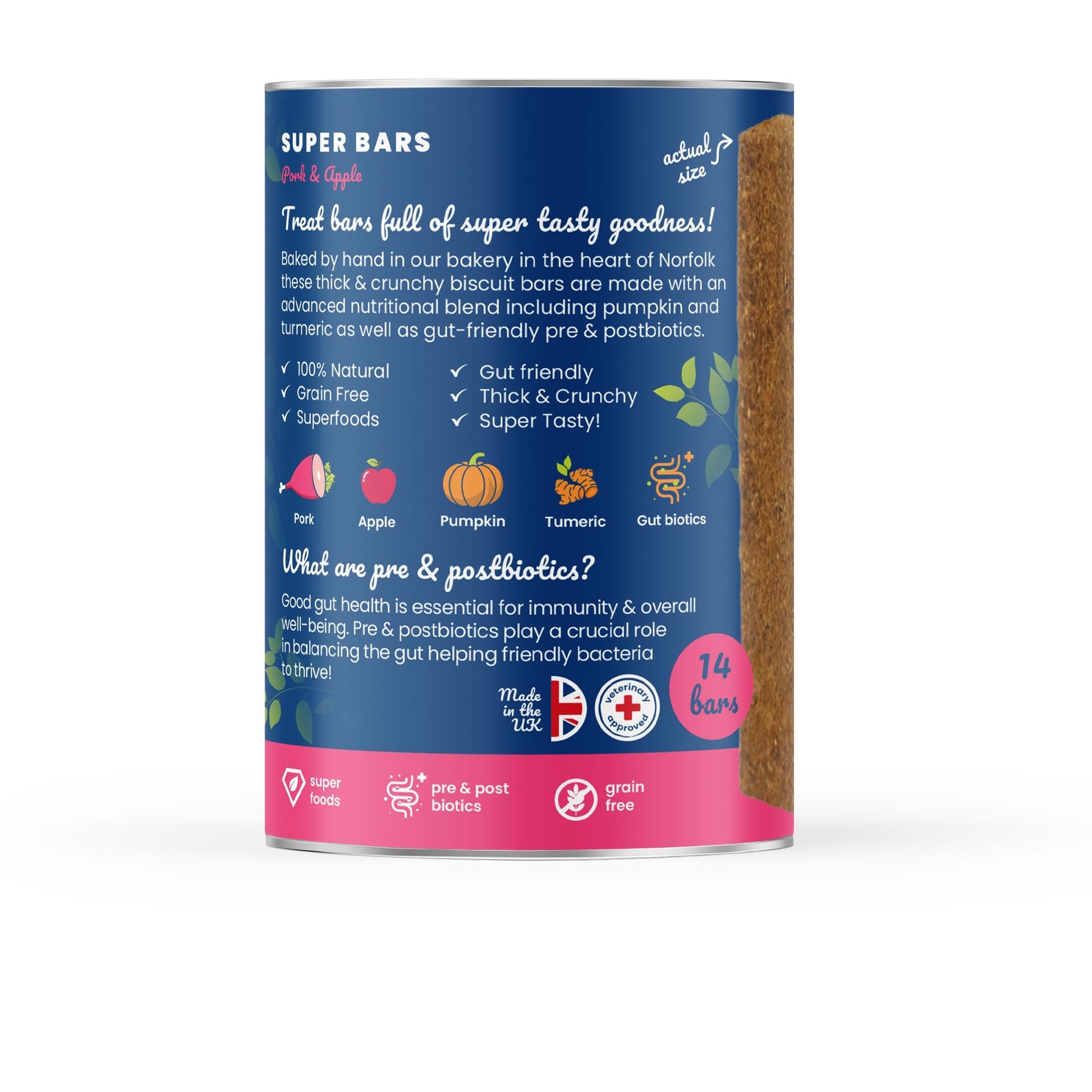 Treat bars full of super tasty goodness! Baked by hand in our bakery in the heart of Norfolk, these thick & crunchy biscuit bars are made with an advanced nutritional blend. Full of delicious, healthy ingredients, such as pumpkin and turmeric, as well as gut-friendly pre & postbiotics.